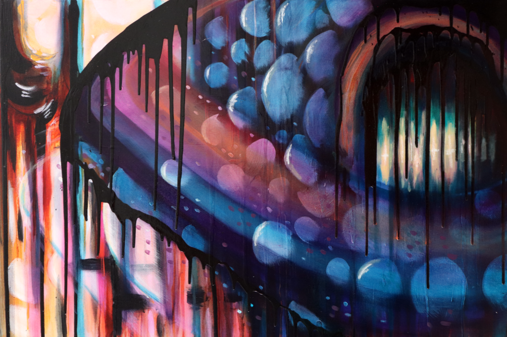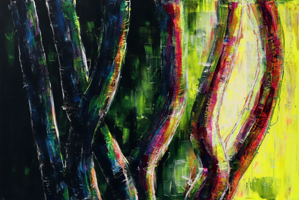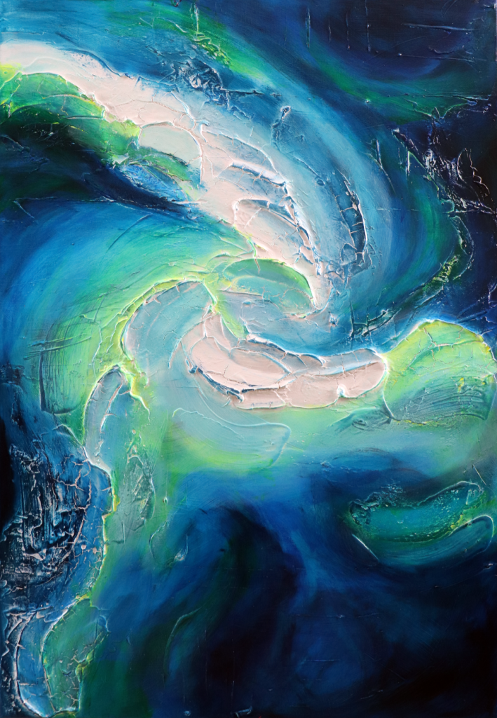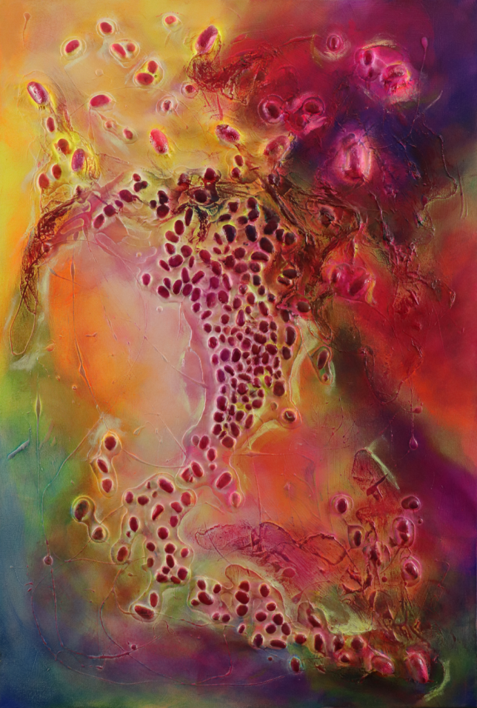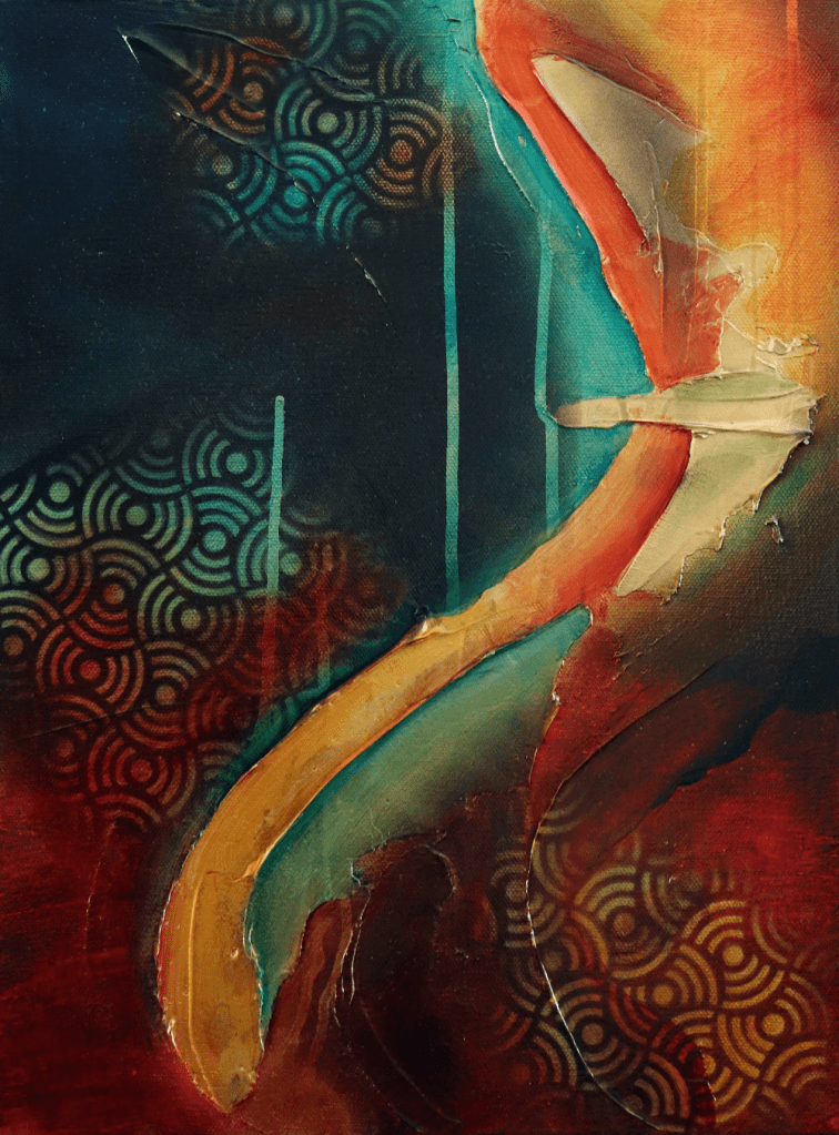 Like choosing a book by the cover, I can see only the beginning. The starting point. A painting may begin with a texture, a color combination, a tool, an object, a transition, or a contrast. Each painting is created from a million choices, experiments, moments of elation or despair, and sparks of playfulness or apathy. What happens if I try to create a gradient with orange and blue, or what effect will I get if I apply the paste with this tool, or I wonder what will happen if I add a transparent layer of brown over the pink? There are millions of decisions and layers that the viewer will never see.