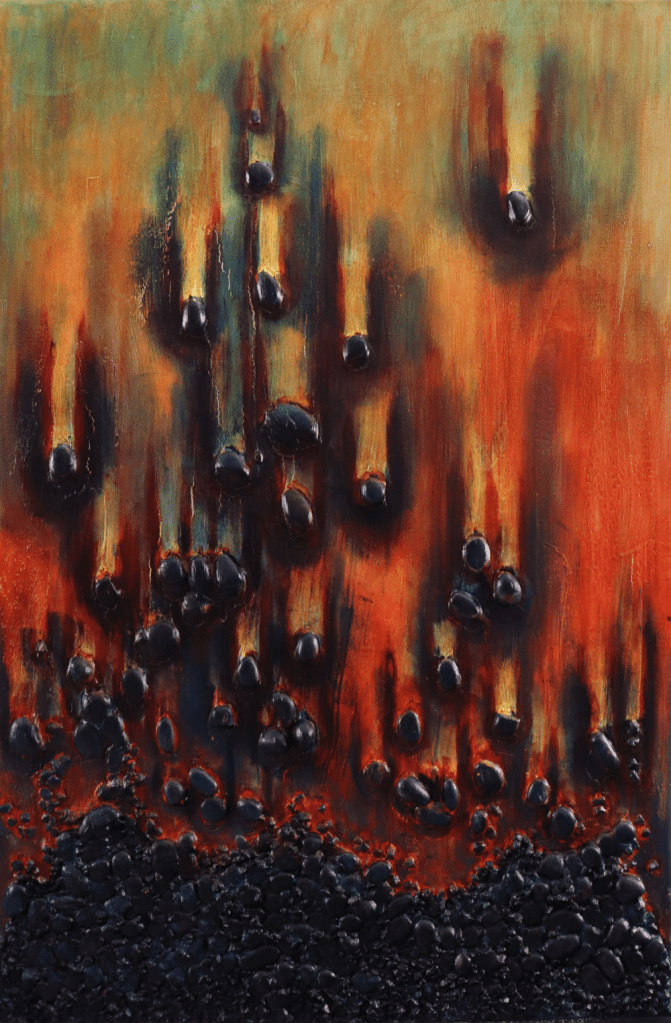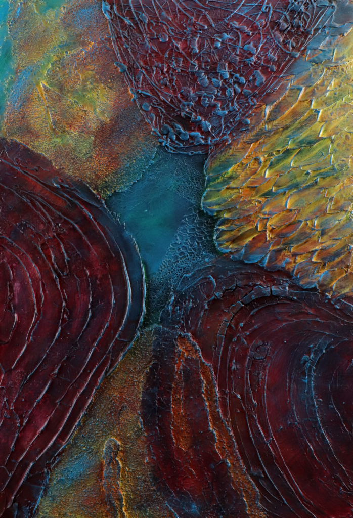 Beneath the veneer of ‘finished’ is more than one almost painting. A piece of art that didn’t quite have the right feel, say the right words, or have the sense of story captured in its textures, colors, and shapes that I wanted. Each painting is a story told with rocks, fabric, sticks, paste, lace, and layers of paint.